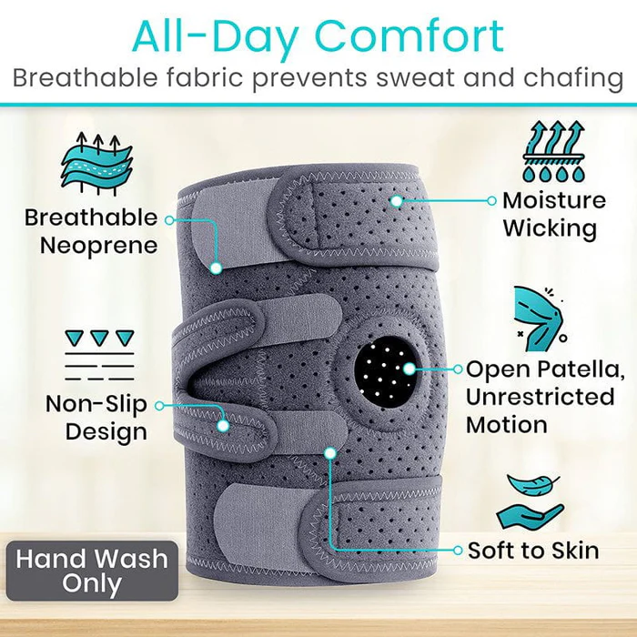 El diseño con apertura en la rótula permite reducir la presión sobre la articulación y mejorar la ventilación durante el uso. Esto facilita un movimiento más natural de la rodilla mientras mantiene el soporte necesario.